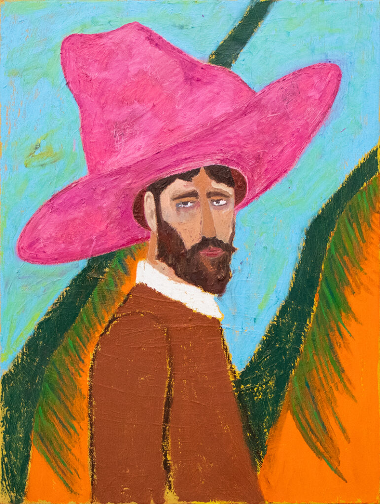 Born in Butte, Montana, Ben Crase lives and works in San Diego, California. Crase’s figurative works depict self portraits in skewed, playful interiors, imbued with a sense of optimism and humour with signature pink hats symbolising camaraderie, compassion and kinship.