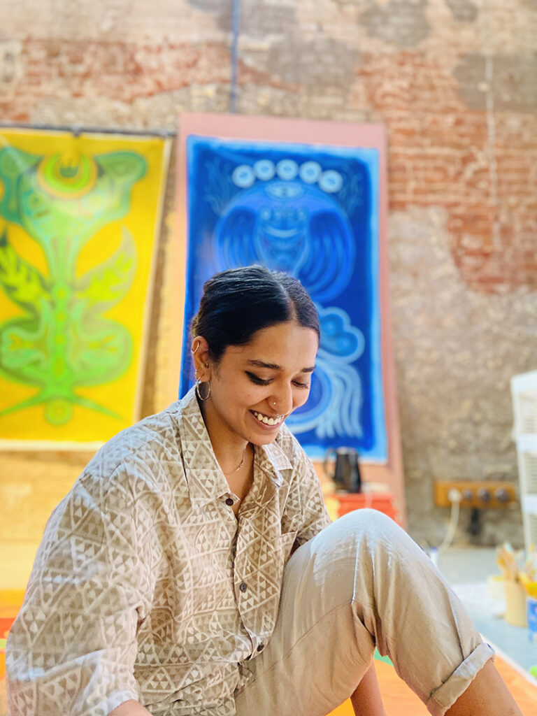Thakore (b. 1997, Vadodara, Gujarat, India) studied painting at the Maharaja Sayajirao University of Baroda in India and subsequently received her MA in painting at the Royal College of Art in London, where she currently lives and works. She has worked with a variety of mediums, from painting and sculpture, to found objects, constructing narratives that are transformative and inquisitive of our cultural roots.