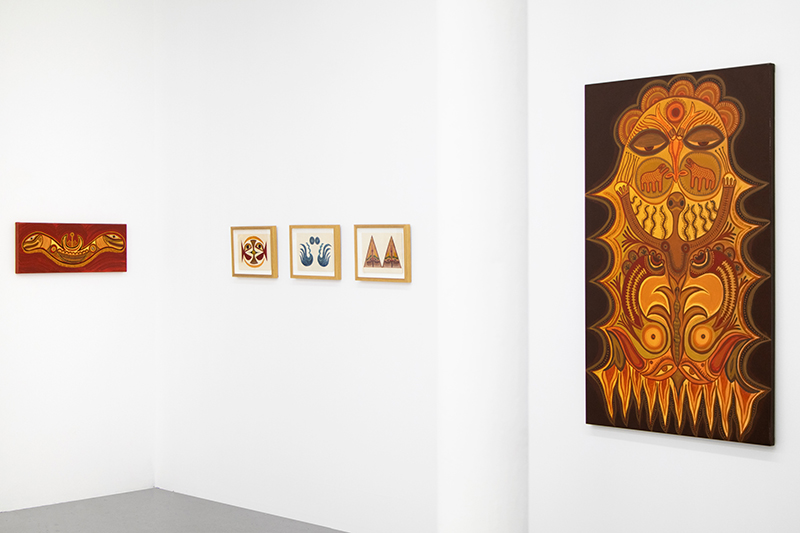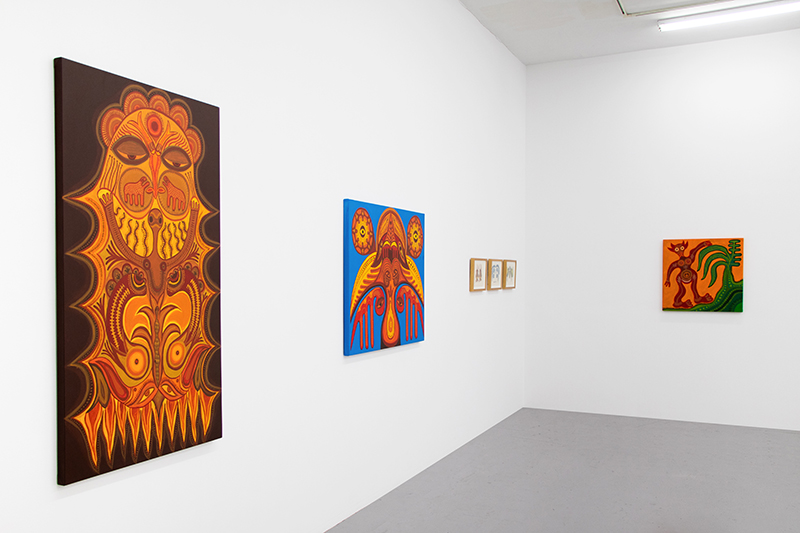 BY USING SYMBOLS AND OTHER ABSTRACT FICTIONAL CREATURES I AM TRYING TO CREATE AN IMAGINARY WORLD OF MY OWN WHICH DRIVES OUT FROM FANTASIES AND POINTS TOWARDS THE DIVINE BEING… THE FORMS THAT ARE LIVING IN AN IMAGINARY WORLD TEND TO RAISE QUESTIONS ABOUT THEIR EXISTENCE AND NATURE. THEY HAVE THEIR OWN LIGHT AND EXIST WEIGHTLESSLY. LOOKING AT VISUALS FROM ANCIENT, PRIMITIVE, AND ONGOING TRIBAL AND FOLK PRACTICES, IS A VERY INTRIGUING PART OF MY PRACTICE AS IT QUESTIONS THE BASIC PRIMITIVE BEHAVIOUR OF HUMANS, WHICH IS QUITE RELATABLE TO THAT OF AN ANIMAL. THE PAINTINGS HELP SEEK TRUTH, THEY ENQUIRE OF THE VIEWER TO QUESTION THEMSELVES AND DIG DEEP INTO WHO THEY REALLY ARE, SEEKING THE ORIGINAL TRUTH. THERE IS A CELEBRATION OF LIVING CREATURES RESIDING WITH EACH OTHER IN HARMONY, THEY TAKE SHAPE LIKE HOW WATER FILLS UP STREAMS AND YET CAN FIT INTO A POT.